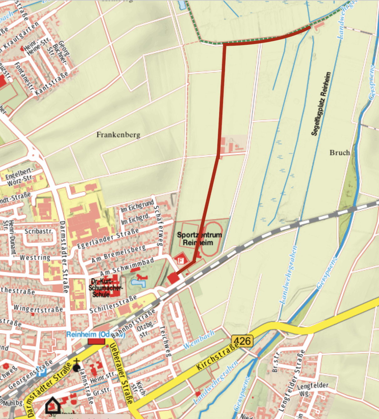 Zwischen der Freiwilligen Feuerwehr Reinheim und dem Sportplatz verläuft ein Weg, der über die Felder auf den Rundweg am Reinheimer Teich führt. An der Weggabelung rechts abbiegen und in ca. 500 m rechts auf den Parkplatz unsere Vereinsgaststätte  Auszeit am Teich einbiegen.
